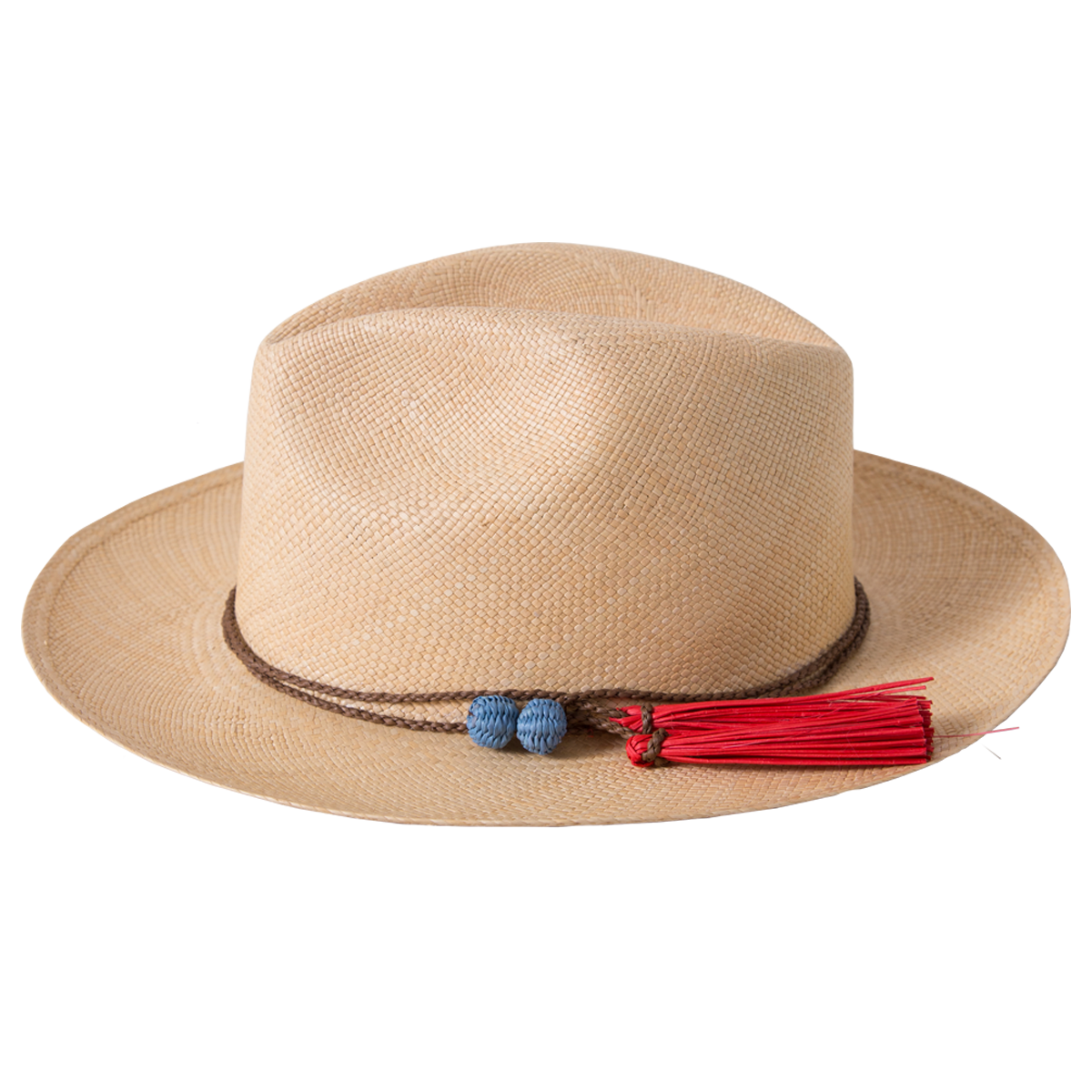 Natural straw, olive toquilla straw braid with red tassels and baby blue pompoms. Standard brim.
