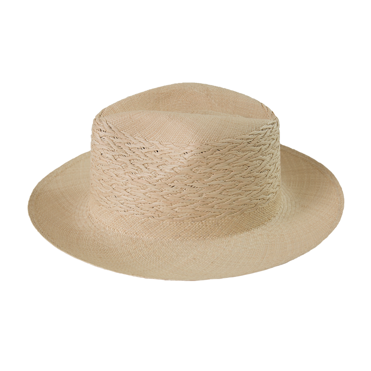 Natural straw with "churo" woven pattern in part of the crown, standard brim.