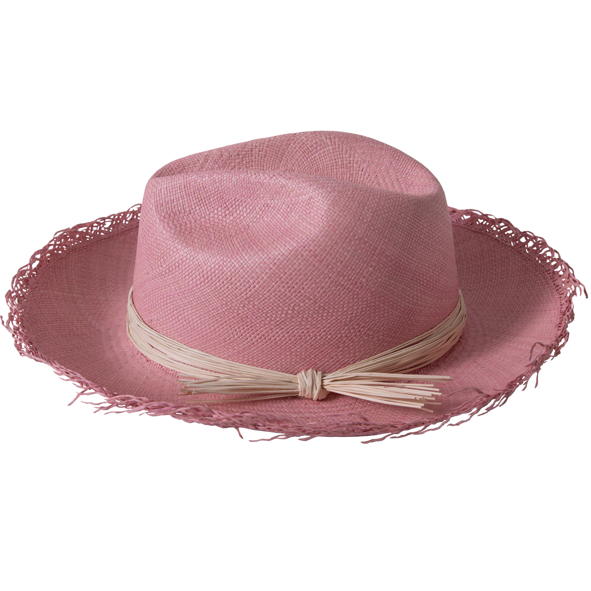 Baby pink straw, natural toquilla straw band with knot, frayed standard brim.