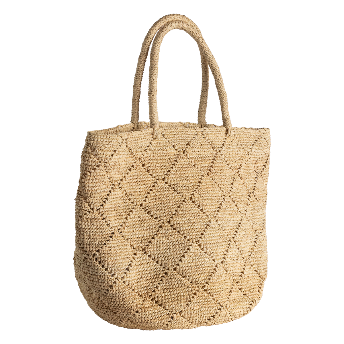 The Isla tote features an intricate diamond-shaped weave, inspired by the textures of coastal landscapes. Its lightweight yet spacious design makes it perfect for casual outings and versatil enough for any occasion.