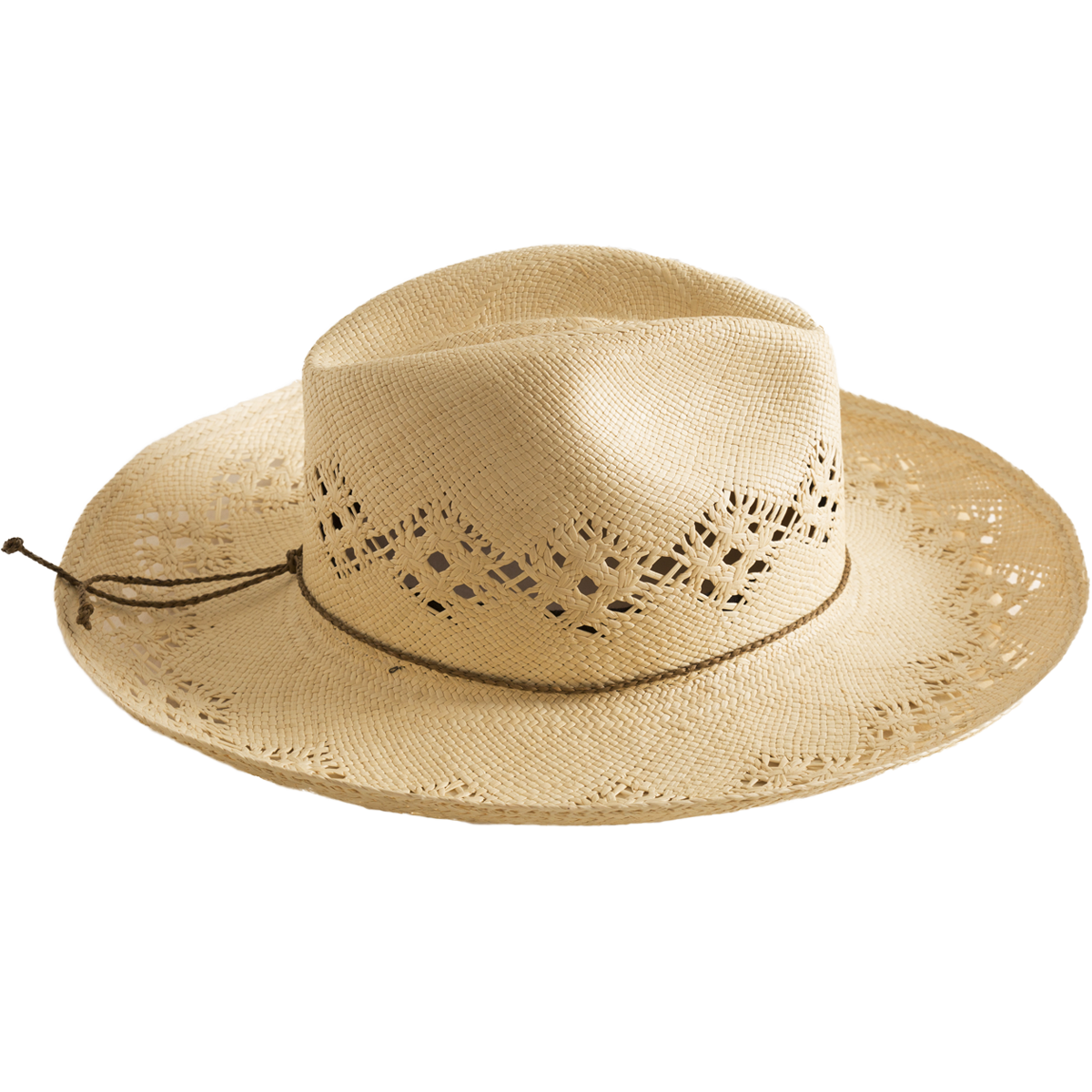 Natural straw with pattern on crown and brim. Brown toquilla straw braid.