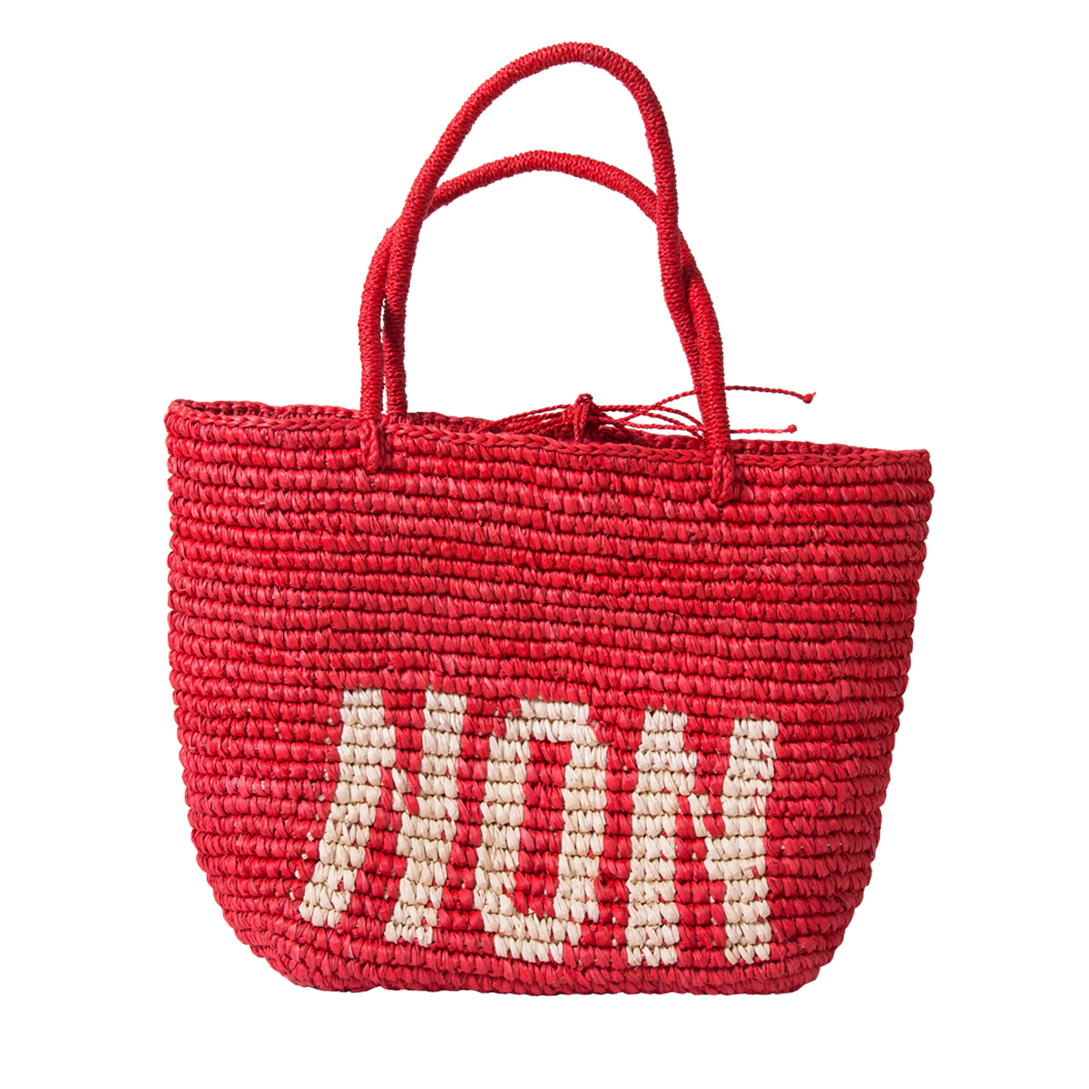 Maxi tote in red and natural straw. Words "Oui" and "Non" are handwoven on each side of the bag.